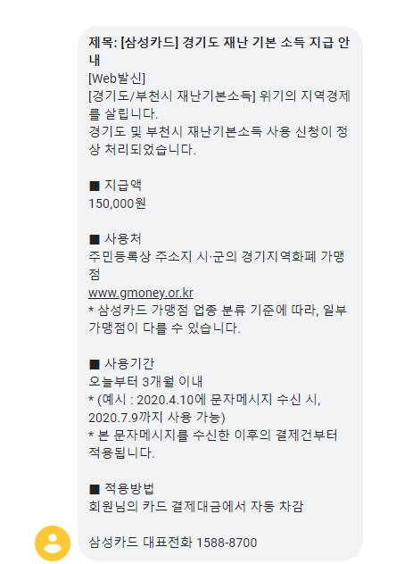 신용카드로 경기도 재난기본소득을 신청하여 사용 승인 문자를 받았습니다