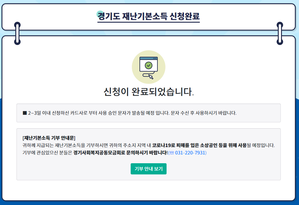 신청 후 이틀만에 경기도 재난기본소득 사용 신청이 정상 처리되었다는 문자가 카드사로부터 날아왔습니다.