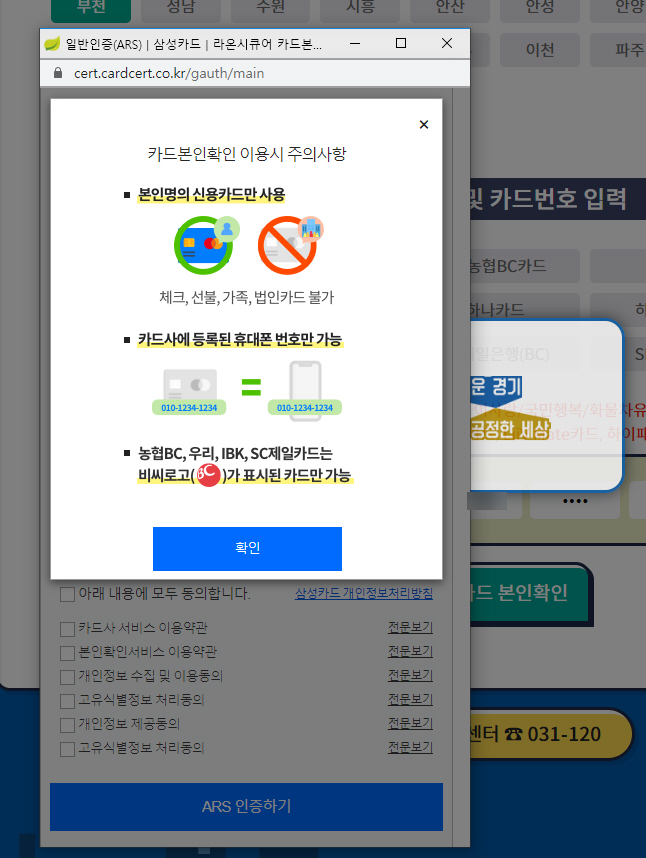저는 삼성카드를 선택했는데, 카드 비밀번호 앞 2자리를 입력하여 ARS 인증을 거쳤습니다.