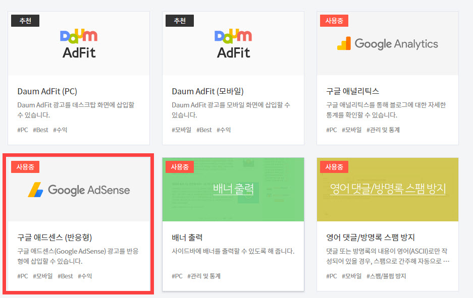 플러그인으로 이동하여 구글 애드센스 (반응형) 플러그인을 선택합니다.
