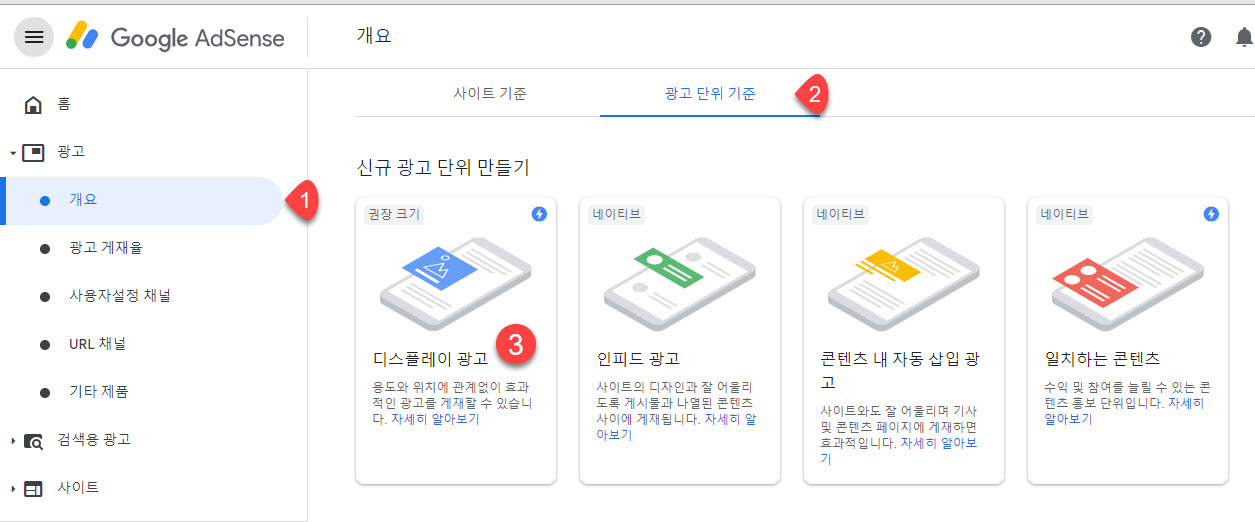 애드센스 계정에 로그인한 다음 개요(①)를 클릭하고 광고 단위 기준 탭(②)을 선택하고 디스플레이 광고(③)를 클릭합니다.