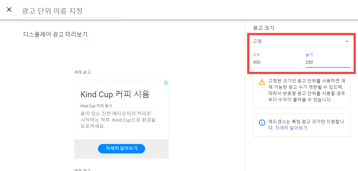 광고 단위 이름을 지정하고 광고 크기를 선택합니다. 광고 크기는 "고정"을 선택하고 300x250px 크기를 지정하여 생성할 수 있습니다.