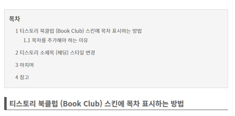 이 글에서 소개한 방법을 이용하면 워드프레스 목차 플러그인에서 제공하는 기능과 비슷하게 구현이 가능합니다. 이 방법을 이용하면 목차 HTML 코드를 일일이 포스트에 입력할 필요가 없으므로 목차에 대해 신경을 쓰지 않아도 됩니다. 이 방법은 북클럽(Book Club) 스킨에서 잘 작동합니다. 다른 스킨에서도 잘 작동할 것 같지만, 스킨에 따라 클래스(class)명이 달라 제대로 작동하지 않을 수 있습니다. 그런 경우 아래 댓글로 블로그 주소를 남겨주시면 체크해드리겠습니다.