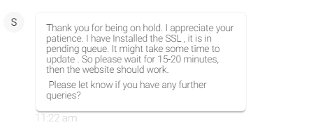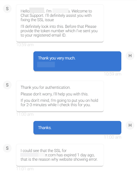 블루호스트 상담원이 문제 해결을 시도했지만 잘 안 되어 인증서를 새로 설치해주었습니다. 이 때문에 실제 문제 해결에 약 20분 정도 소요되었습니다.