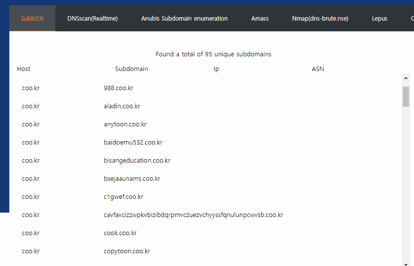 그리고 NMMAPPER 서비스를 이용하여 검색해보면 95개의 서브도메인이 검색됩니다.