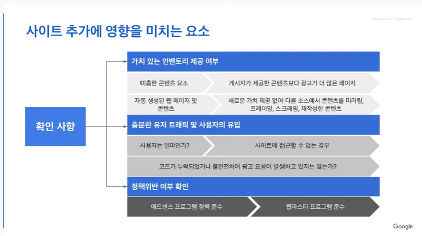 특히 사이트 승인에 영향을 미치는 요소에 대해 구체적으로 밝혔는데요. 다음은 구글 영상에서 캡처한 것입니다.