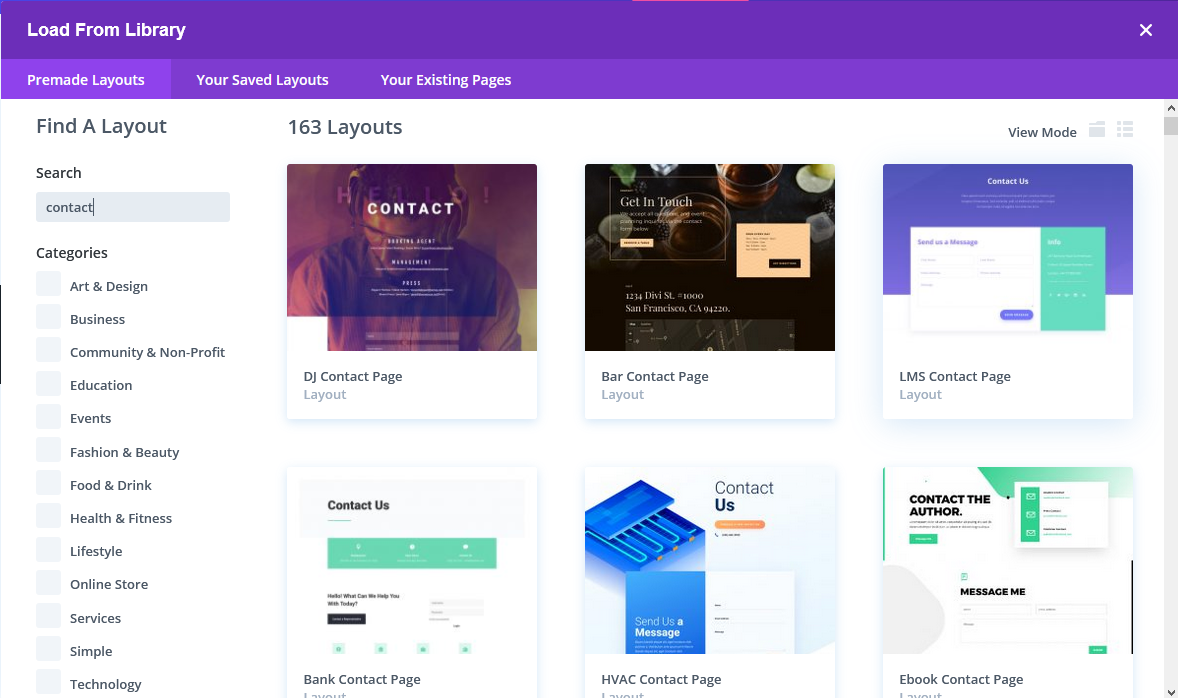 특정 기능의 페이지를 만드는 경우 (예: 문의 페이지) 검색 기능을 사용하면 편리하게 해당 기능의 레이아웃을 찾을 수 있습니다.