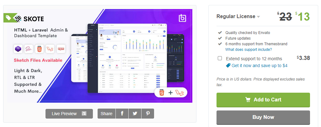 Skote는 HTML & Laravel 7으로 된 완전한 기능의 프리미엄 어드민 알림판 템플릿으로 개발자에게 친숙한 코드와 몇 가지 재사용 가능한 컴포넌트가 포함되어 있습니다. Sketch 파일 또한 이 템플렛에서 사용할 수 있습니다.