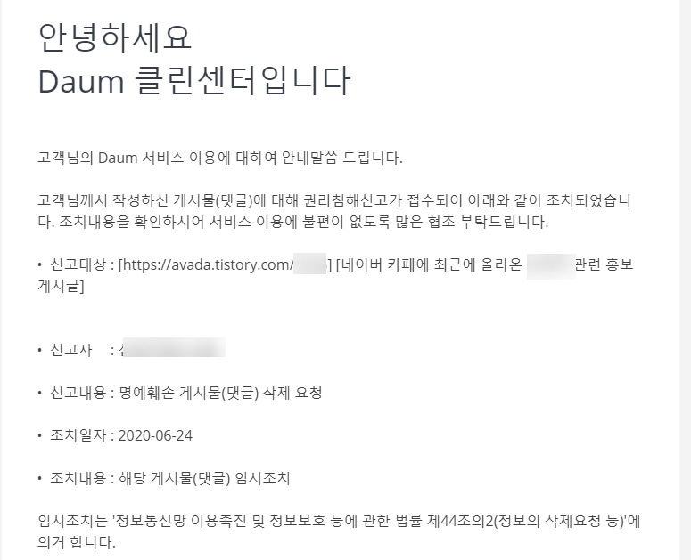 이 티스토리 블로그를 운영하면서 처음으로 Daum으로부터 명예훼손 권리침해신고가 접수되어다는 메일을 받았습니다.