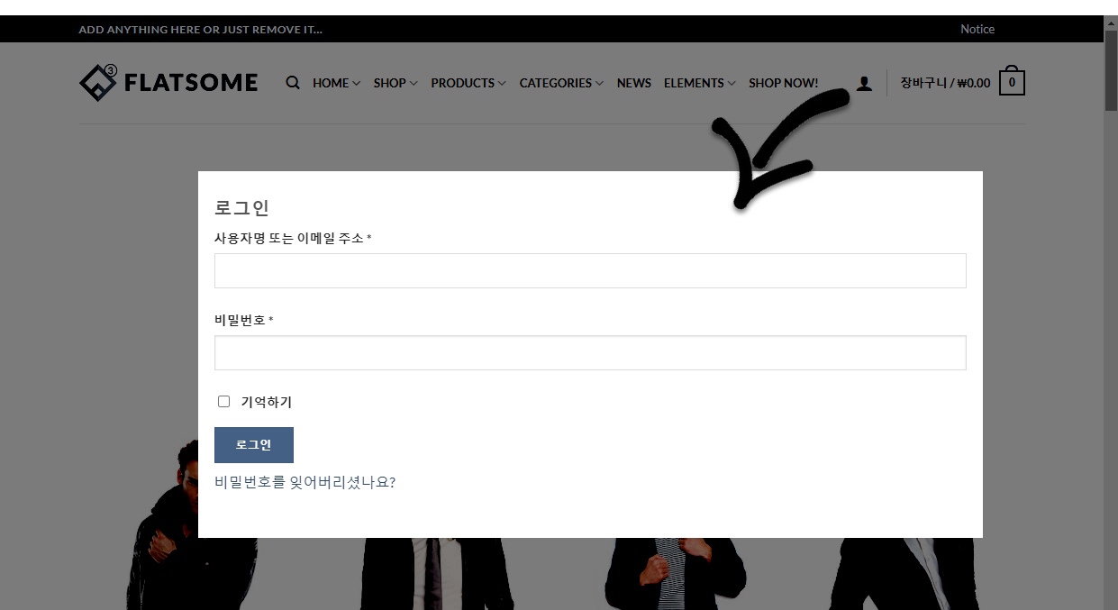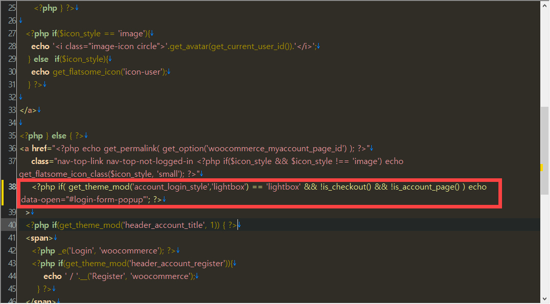 모달 팝업 창으로 표시되는 것을 원치 않는 경우에는 wp-content/themes/flatsome/template-parts/header/partials 폴더 아래의 element-account.php 파일을 찾아서 아래에 표시된 라인을 삭제하면 됩니다.