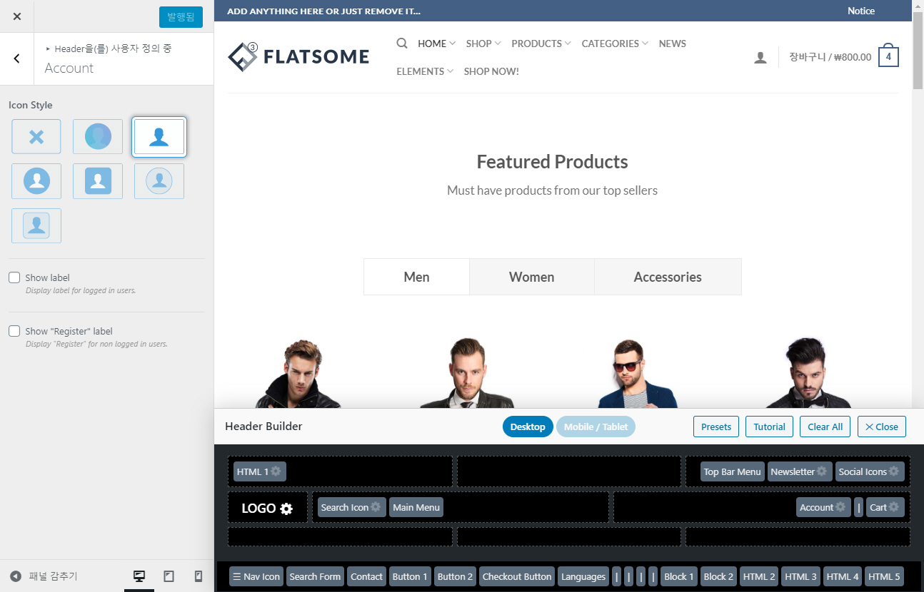 Account 옵션은 워드프레스 관리자 페이지 > 테마 디자인 > 사용자 정의하기 > Header > Account에서 설정할 수 있습니다.