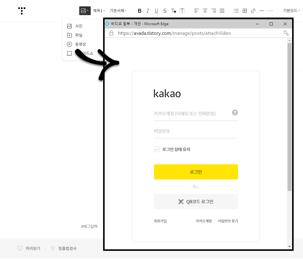 티스토리 글쓰기 화면에서 동영상을 업로드하려면 카카오 계정에 로그인해야 합니다.