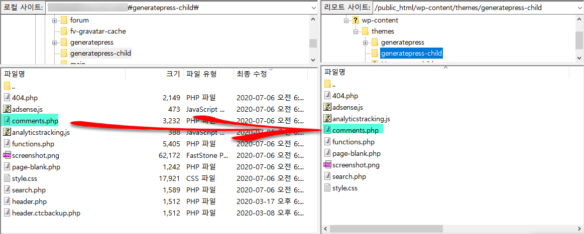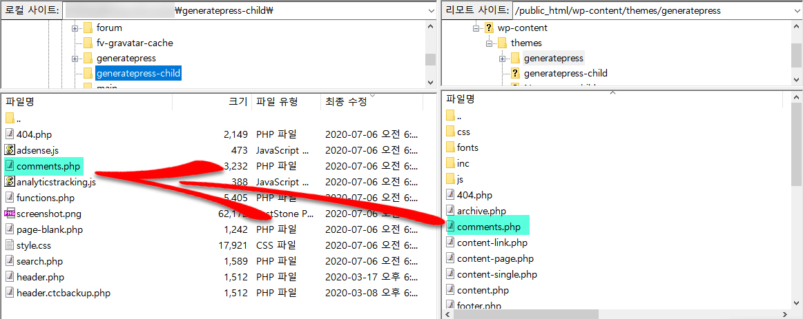 2) PC로 다운로드한 comments.php 파일을 차일드 테마 폴더(예: /wp-content/themes/generatepress-child)로 업로드합니다.