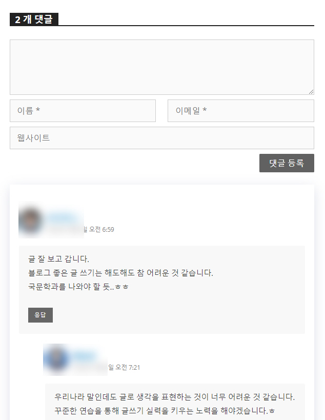 GeneratePerss 테마의 댓글 섹션은 그대로 사용하기에는 조금 이질감이 느껴질 것 같습니다. 아무런 커스텀을 하지 않으면 다음 그림과 비슷하게 댓글이 표시됩니다.