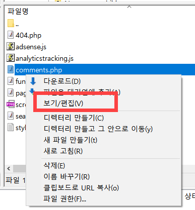 3) 업로드한 파일을 선택하고 마우스 오른쪽 버튼을 클릭한 다음 보기/편집을 클릭합니다(FileZilla 사용 시). 그러면 텍스트 편집기에서 comments.php 파일이 열립니다.