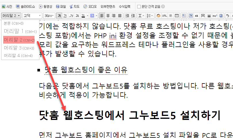 구형 편집기에서는 헤딩 태그가 머리말 1, 머리말 2... 등의 용어로 표시되어 있습니다.