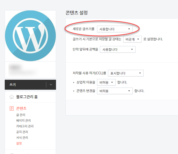 새로운 글쓰기를 "사용합니다"를 선택하면 새 에디터에서 글을 작성하게 됩니다. "사용하지 않습니다"를 선택하면 구형 에디터를 사용하게 됩니다.