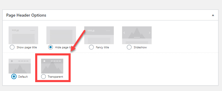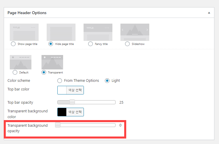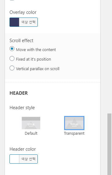 페이지 헤더 옵션에서 Transparent (투명)를 선택합니다. 그러면 숨겨져 있던 '투명' 관련 옵션이 표시됩니다.
