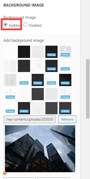 참고로 카테고리 페이지 등 페이지의 헤더를 투명하게 설정하려는 경우 Theme Options > Page Titles를 클릭하고 Style 섹션을 이동한 다음, Background Image 옵션을 Enabled로 설정하고 이미지를 지정하거나 업로드합니다.