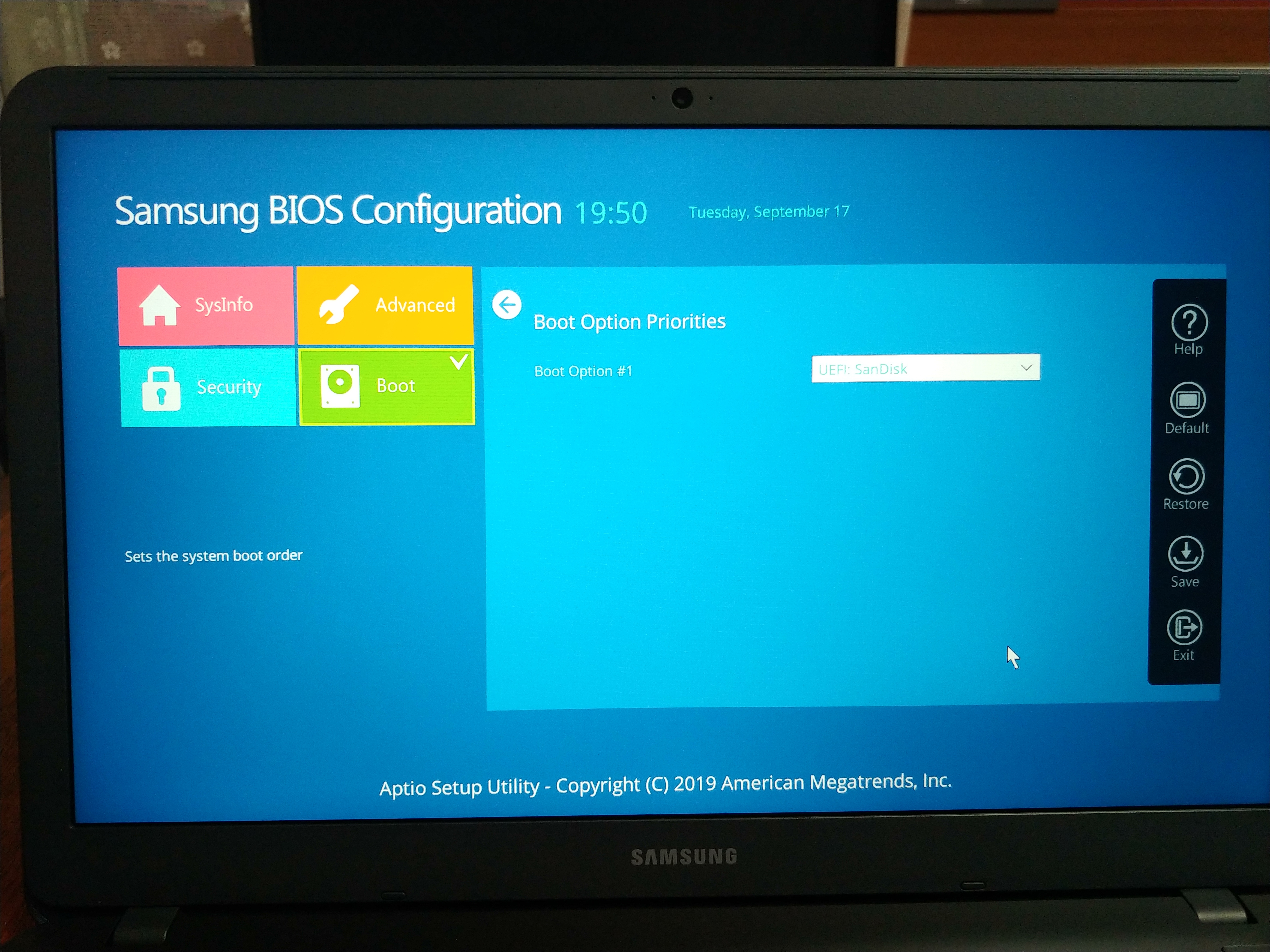 Boot (부팅) 아이콘을 클릭하고 부팅 옵션에 USB 메모리를 선택합니다. 위의 사진에서는 UEFI: SanDisk로 USB 메모리가 인식되네요. Save를 누르고 다시 컴퓨터를 시작하면 윈도우 설치가 시작됩니다.