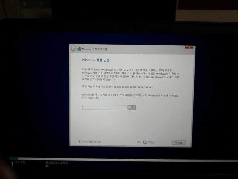 Windows 정품 인증 화면이 표시되면 제품 키가 있는 경우 제품 키를 입력하면 되고, 없는 경우 제품 키가 없음을 선택하고 설치 후에 제품 키를 입력하여 정품인증을 할 수도 있습니다.