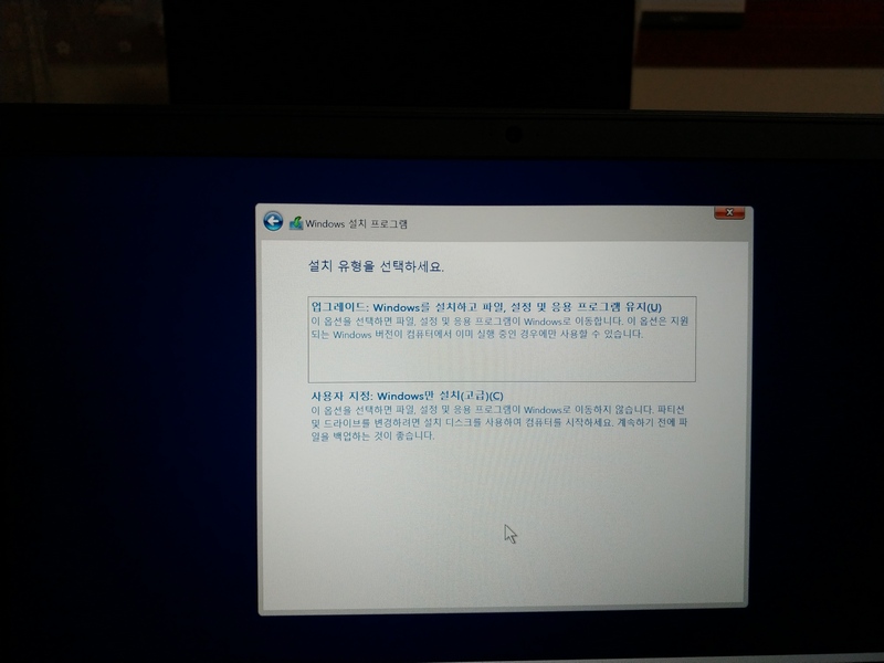 윈도우를 새로 설치하는 경우에는 다음 화면이 표시되면 "사용자 지정: Windows만 설치"를 선택하도록 합니다.