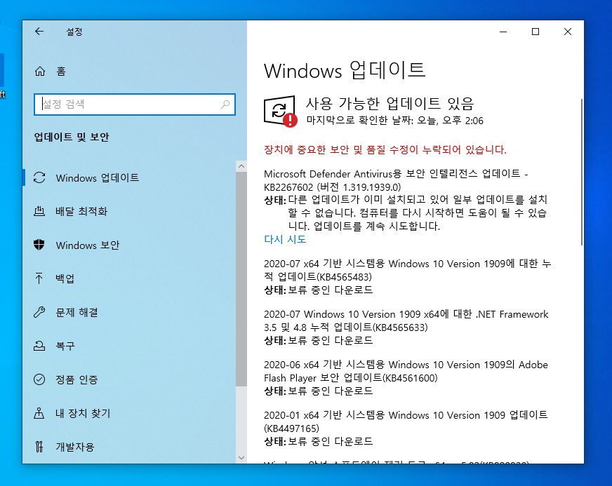 경우에 따라 아래 그림과 같이 "장치에 중요한 보안 및 품질 수정이 누락되어 있습니다" 오류가 발생하면서 업데이트에 실패할 수 있습니다.