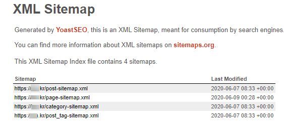 보통의 경우 XML 사이트맵 파일이 브라우저에 표시됩니다. (Yoast SEO의 사이트맵 경로는 사이트주소/sitemap_index.xml입니다.)