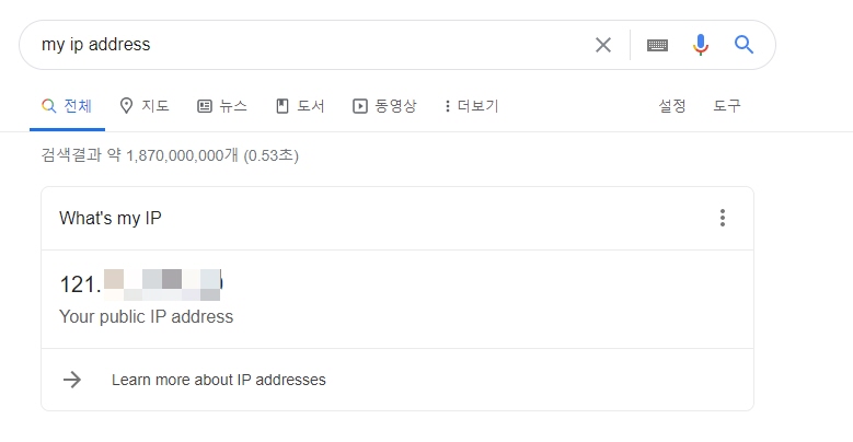 여기에서 xxx.xxx.xxx.xxx 부분은 허용할 IP 주소를 입력하도록 합니다. 내 컴퓨터의 IP 주소는 구글에서 My IP Address로 검색하면 확인할 수 있습니다.