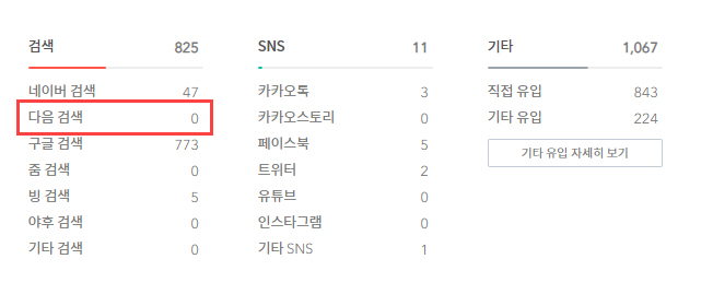 하지만 이 블로그의 경우 다음 검색엔진에서 글이 수집되지만 다음 검색 유입이 사실상 제로 상태입니다. 실제로 얼마 전에 다음 유입이 며칠간 제로가 되었습니다.