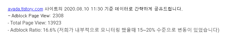 제 블로그에서는 약 15~20% 정도의 사용자들이 애드블록을 사용하고 있는 것으로 파악되고 있습니다. 이 수치는 일반적으로 예상하는 수준에서 크게 벗어나지 않는 것 같습니다.