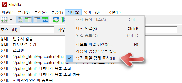 파일질라(FileZilla)의 경우 서버 > 숨김 파일 강제 표시 옵션을 선택하면 숨김 파일이 표시됩니다.