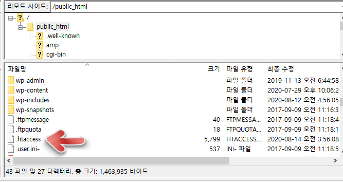 FTP 클라이언트(예: 파일질라)를 통해 서버나 웹호스팅 서버에 접속하여 워드프레스 설치 파일이 위치한 루트 폴더로 이동하면 .htaccess 파일을 찾을 수 있습니다.