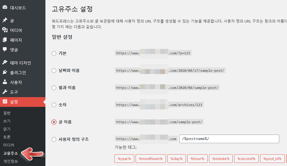 "기본"으로 설정하면 일부 테마나 플러그인에서 문제를 일으킬 수 있고, SEO에도 바람직하지 않으므로 가급적이면 다른 옵션(예: 글 이름)을 선택하시기 바랍니다.