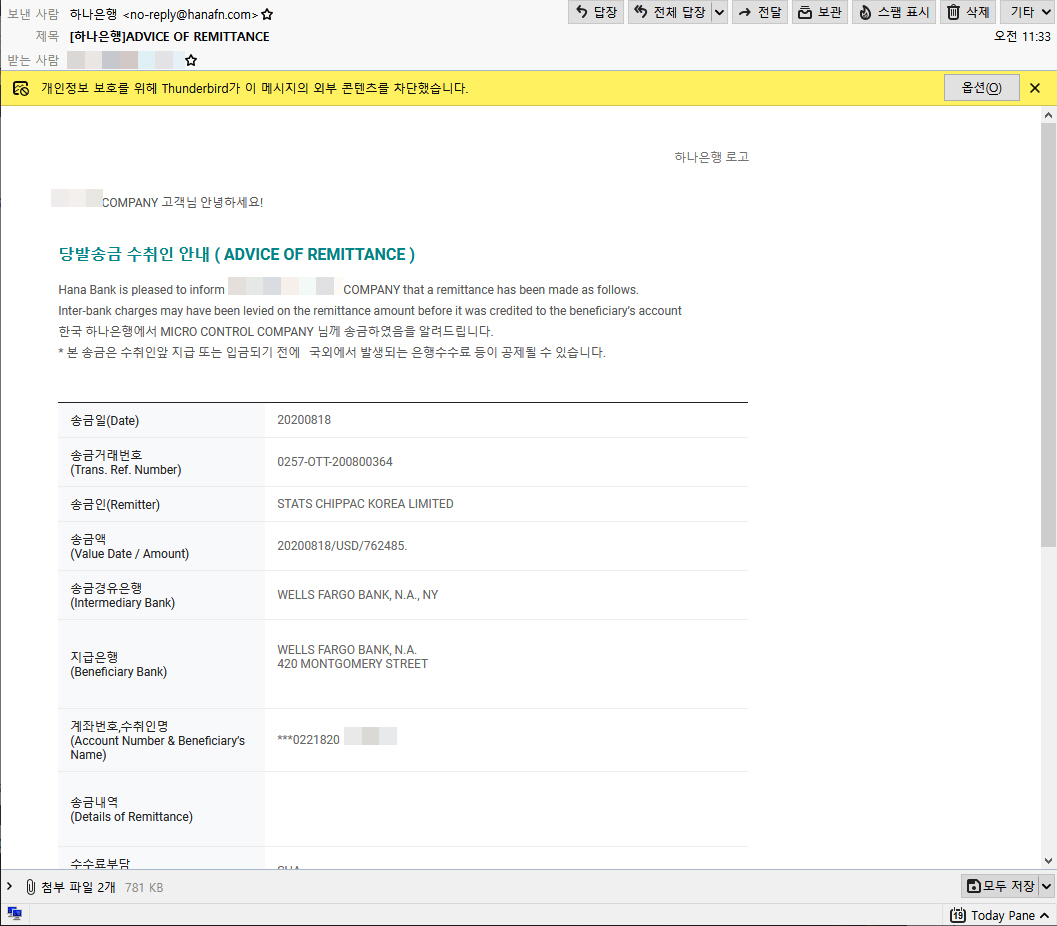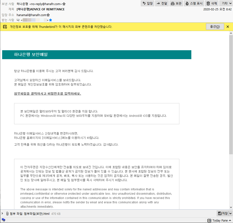 어제 하나은행에서 외화 송금을 받았다는 외화 송금 메일을 받았습니다. 저는 애드센스 수익금 외에 받을 돈이 없고, 애드센스 수익금은 21일에 송금되어 22일이나 23일(혹은 그 이후)이 되어야 들어오기 때문에 메일을 받자마자 피싱 메일일 것이라는 확신이 들었습니다.