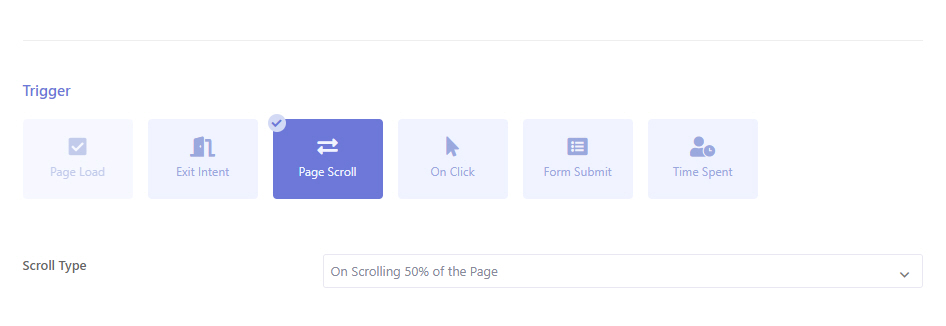 기본적으로 페이지 로드 (Page Load) 시에 팝업이 표시되지만, 페이지를 벗어나거나 (Exit Intent), 페이지를 스크롤 하거나 (Page Scroll), 클릭하거나 (On Clcik), 양식을 제출하거나 (Form Submit), 일정 시간이 지난 후(Time Spent)에 팝업을 표시하는 것이 가능합니다.