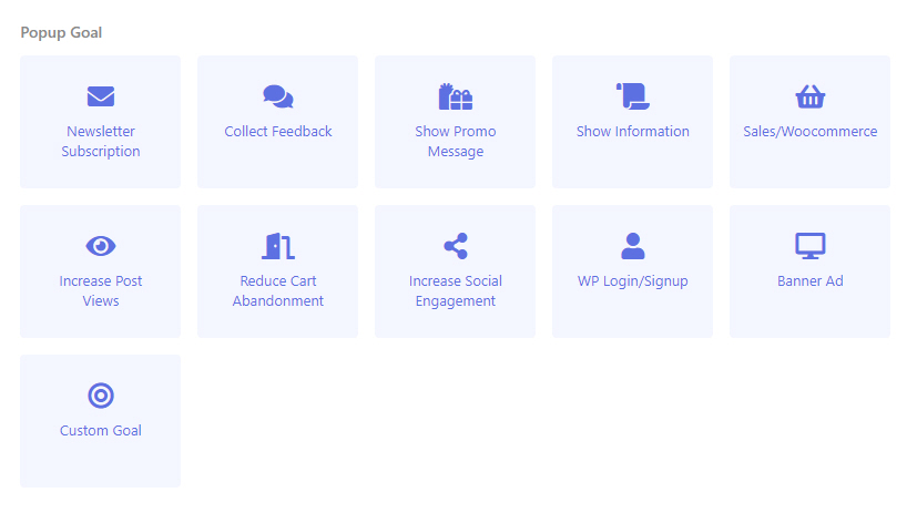 Brave Popup Builder에서는 다양한 팝업 유형(Popup Goal)이 제공됩니다.