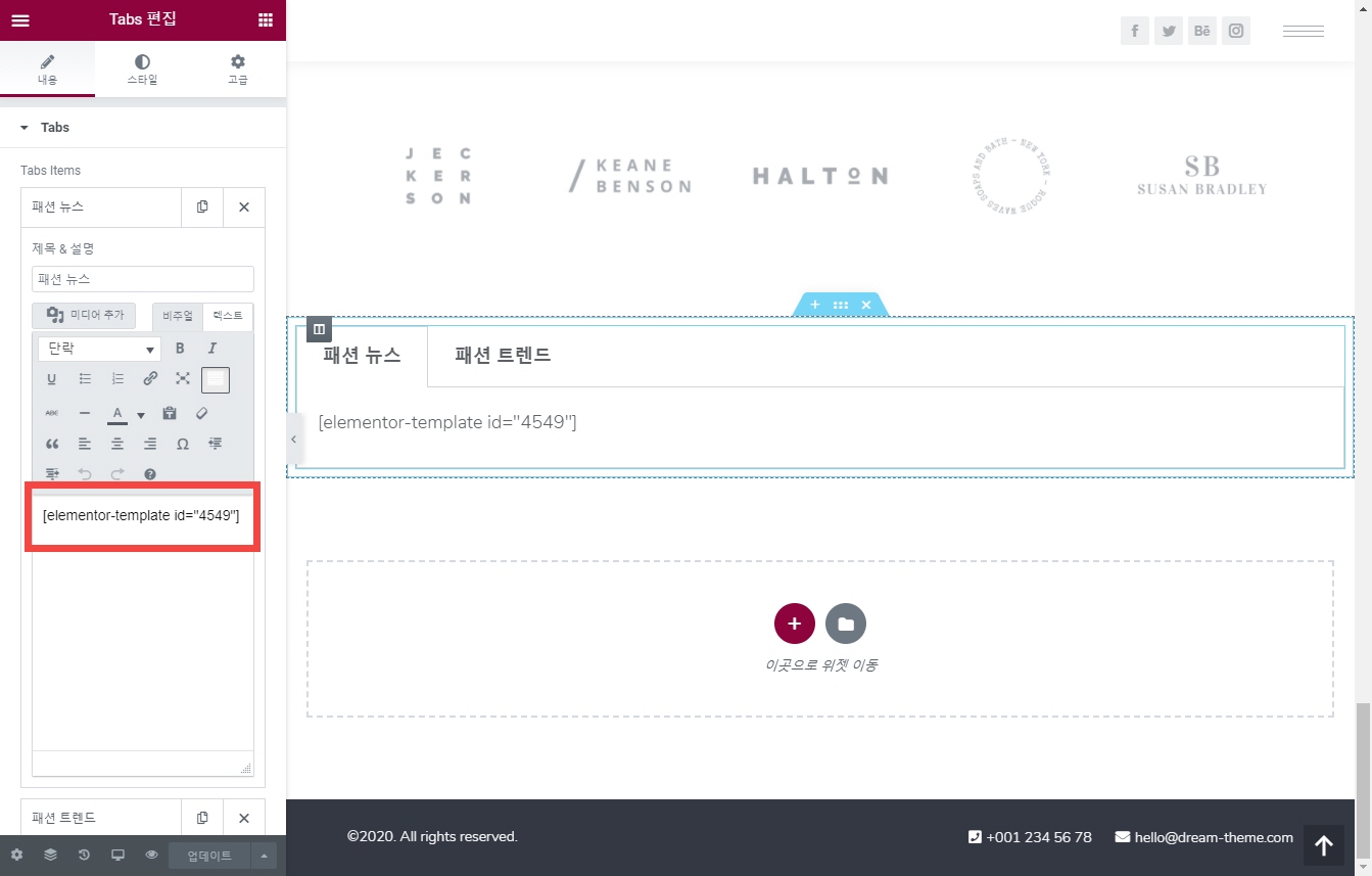 엘리멘터 페이지 빌더에서 탭 (Tabs) 요소를 사용할 경우 탭 내의 콘텐츠 영역에 숏코드를 삽입할 수 있습니다.