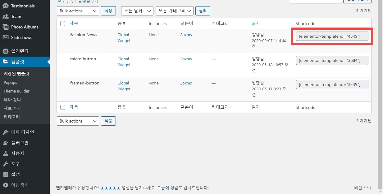 그리고 글로벌 위젯으로 저장하면 숏코드도 생성되므로 숏코드를 활용할 수 있습니다. 워드프레스 관리자 페이지 > 템플릿 > 저장된 템플릿에서 글로벌 위젯 리스를 확인할 수 있고, Shortcode 컬럼에 숏코드가 표시됩니다.