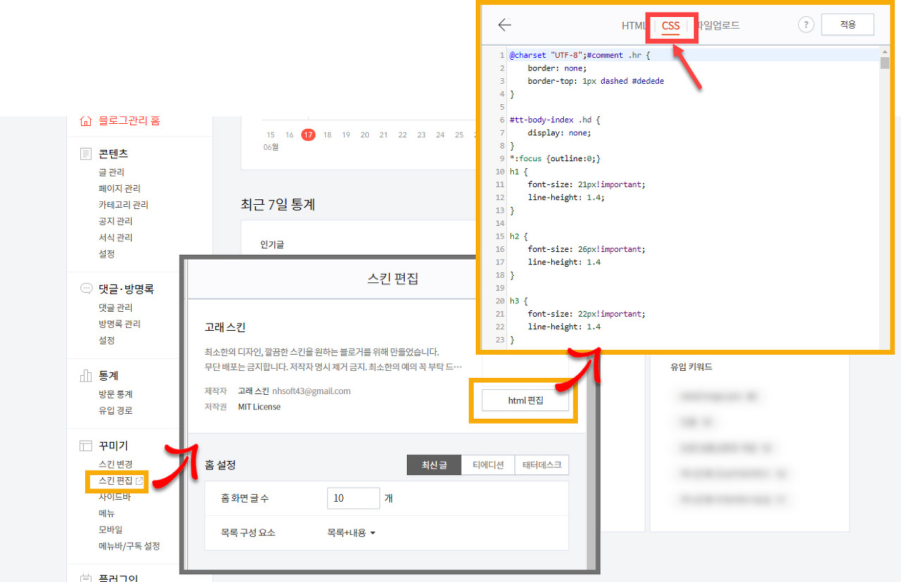 티스토리 블로그에서 CSS 코드를 추가하고 싶은 경우 꾸미기 > 스킨 편집 > html 편집 > CSS 탭의 하단에 추가하도록 합니다.