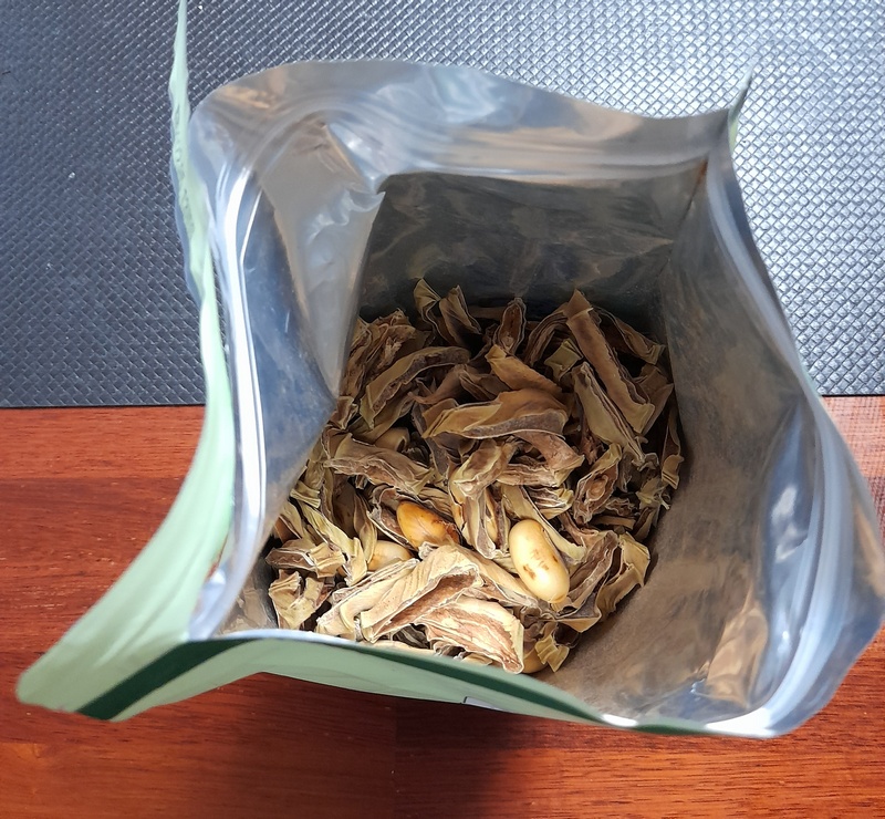 위의 냄비에 보이는 작두콩과 콩깍지는 부스러기들(봉지 맨 아래에 있는)로 크기가 작습니다. 실제로 제품에 든 작두콩은 큰 편입니다.