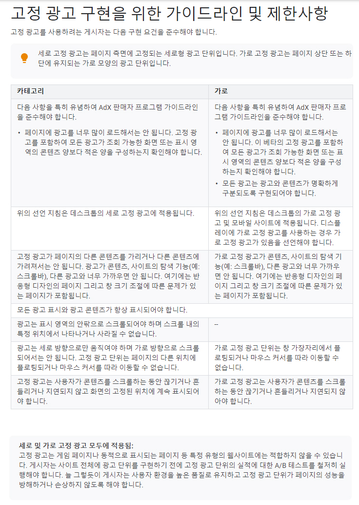 ※세로 고정 광고는 사이드바 등에 고정되는 광고를 의미하고, 가로 고정 광고는 화면 상단이나 하단에 고정되는 광고를 의미하는 것 같습니다. (이 부분에 대해서는 더 찾아보고 정확한 정의가 있으면 업데이트하도록 하겠습니다.)