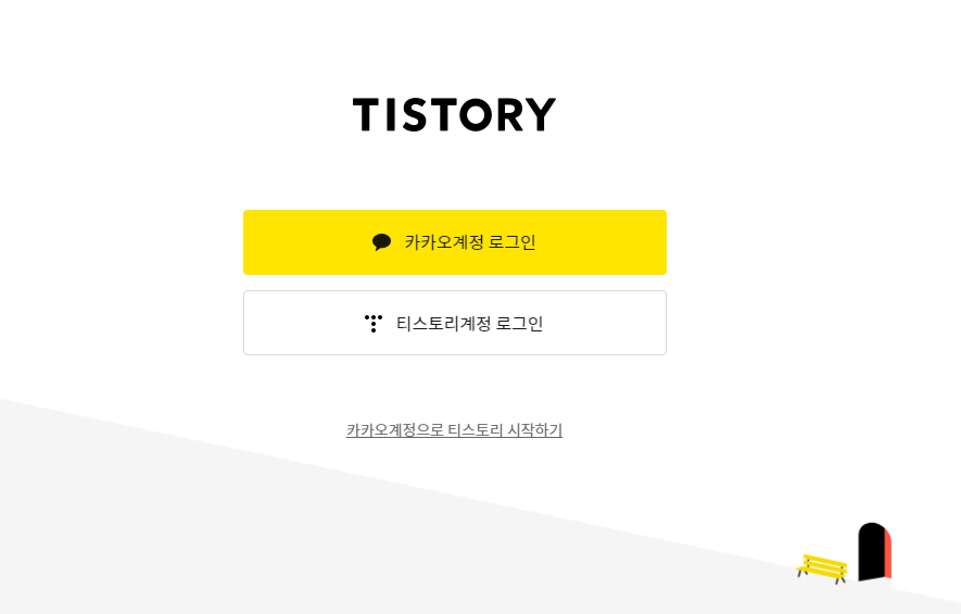 티스토리 계정 로그인 URL을 브라우저에 입력하면(예: example.tistory.com/manage), 카카오계정 로그인 버튼과 티스토리계정 로그인 버튼 두 개가 표시됩니다.