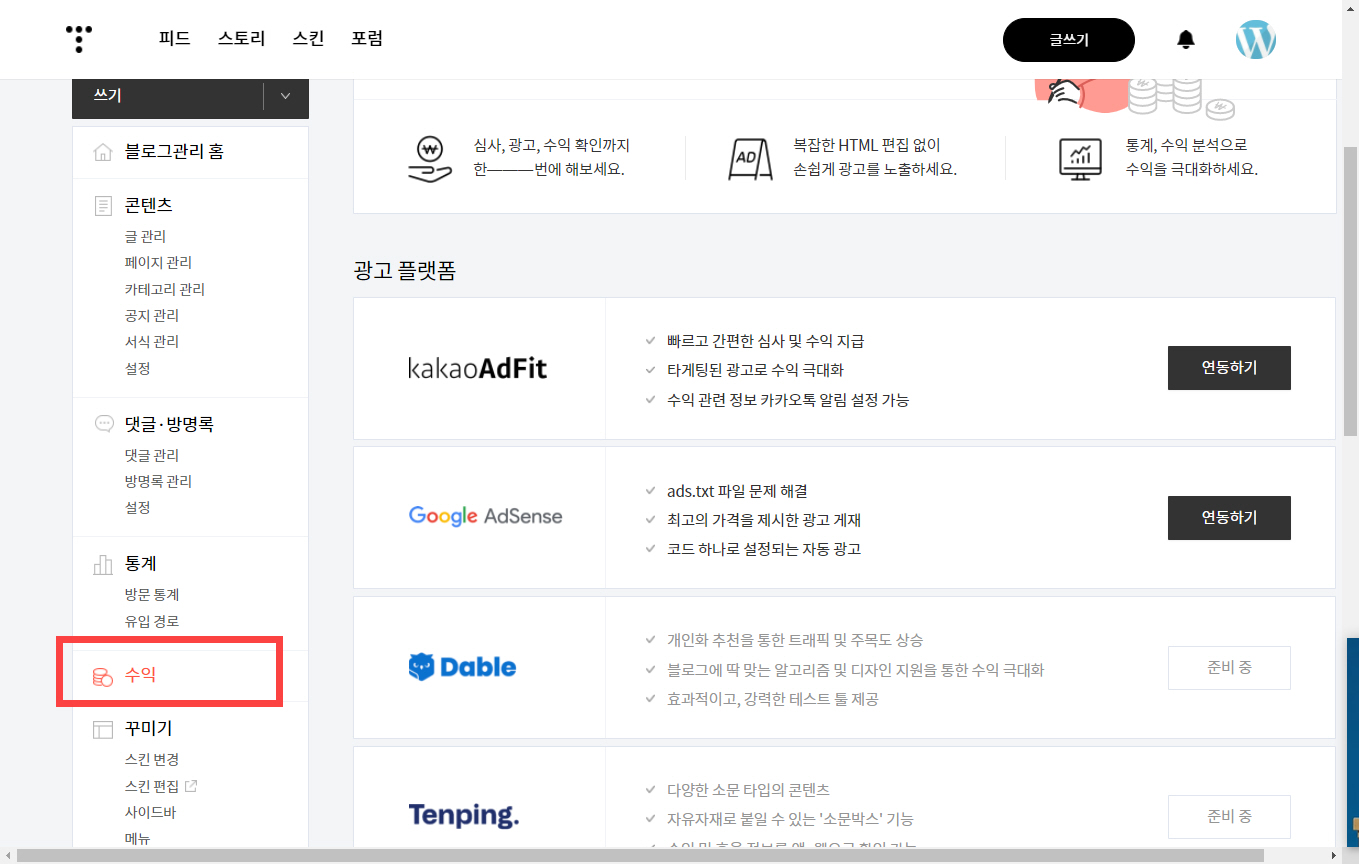 제 블로그는 다음 유입이 거의 없기 때문에 카카오계정을 연결해도 아무런 문제가 안 될 것 같다는 생각이 들어 카카오계정을 연결했습니다. 그리고 구글 애드센스 광고 수익도 방문자 수에 비해 낮은 수준이라서 구글 애드센스도 연동시켰습니다. 다만, 2차 도메인을 연결한 경우에는 구글 애드센스를 연동하면 광고가 표시되지 않는 현상이 나타나네요.