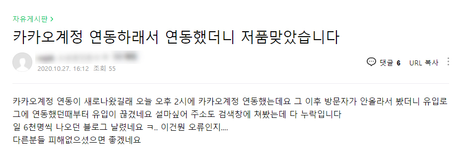 지금 당장은 하지 않고 안정화될 때까지 기다렸다면 하면 좋을 것 같습니다. 카카오계정으로 전환하기 기능이 나오자마자 카카오계정으로 전환했다가 블로그 저품질을 당했다는 분도 계시네요.