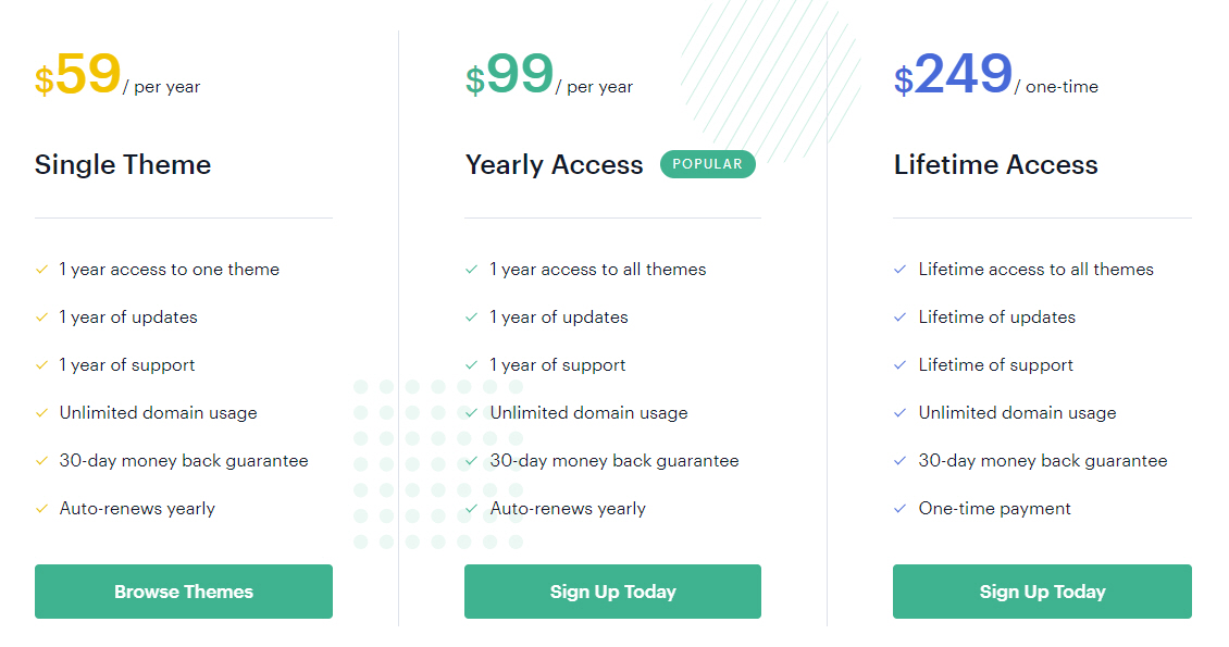 시드니 테마는 Single Theme, yearly Access, Lifetime Access 등 세 가지 플랜을 제공합니다. Single Theme은 1년 동안 업데이트와 지원이 가능하고 무제한 도메인에 사용할 수 있습니다. Yearly Access도 동일하지만, 이 업체가 만든 모든 테마를 이용할 수 있습니다. Sydney 테마만 사용하려면 Single Theme을 선택할 수 있지만 매년 결제해야 업데이트와 지원을 받을 수 있습니다. Lifetime Access는 평생 동안 모든 테마를 사용할 수 있고 업데이트와 지원을 받을 수 있습니다. Lifetime Access는 요금제 이름대로 한 번 결제로 평생 동안 라이선스를 보유하게 됩니다.