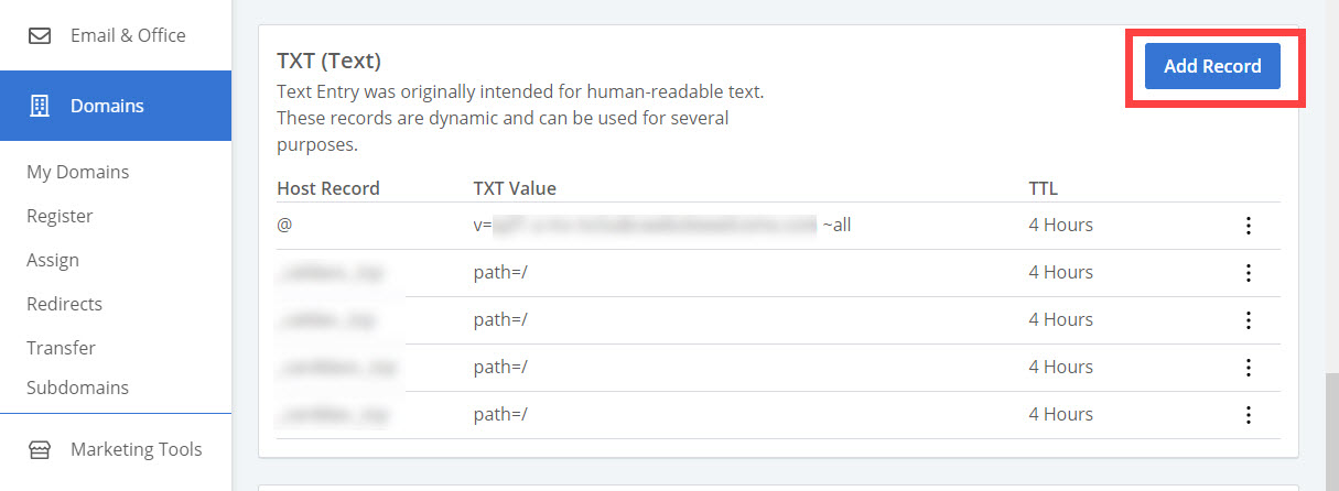TXT (Text) 섹션으로 이동한 다음 Add Record (레코드 추가)를 클릭합니다.