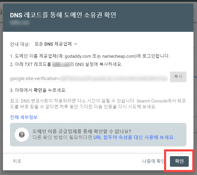 이제 구글 서치 콘솔에서 맨 하단의 "확인"을 누르면 도메인 소유권 확인이 완료됩니다.