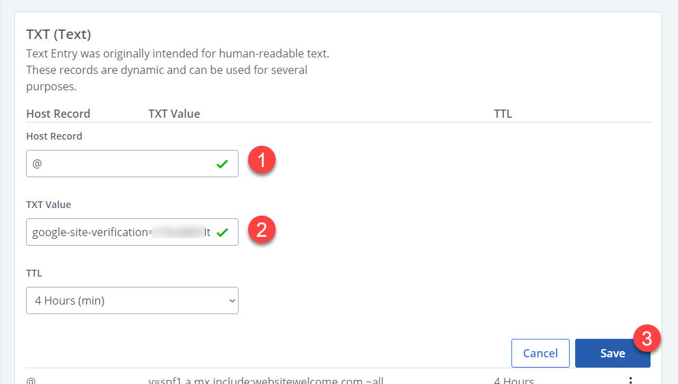 2. TXT Value 필드에는 구글 서치 콘솔의 속성 추가 시에 구글에서 제시하는 TXT 레코드 정보를 입력합니다.