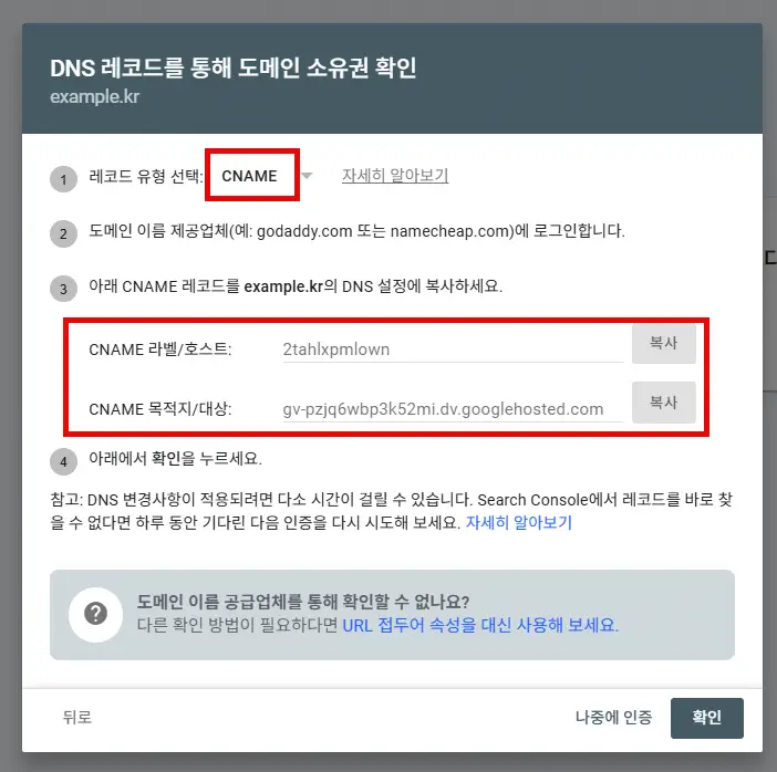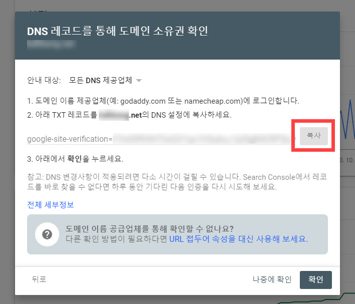 구글 서치 콘솔: DNS 레코드를 통해 도메인 소유권 확인하기